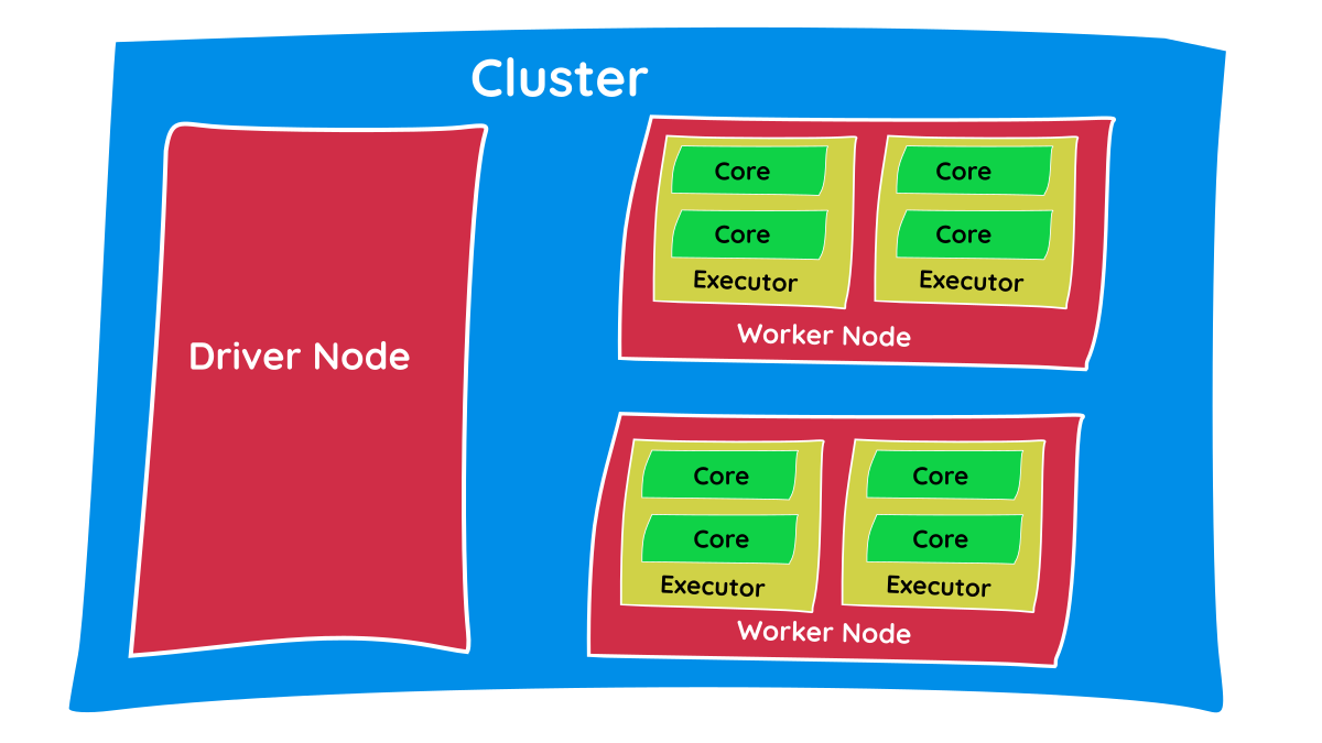 - Nodes: A single computer in a cluster. There are primarily two types of nodes: the master/driver node and the worker node. We’ll see the significance of each in coming sections.